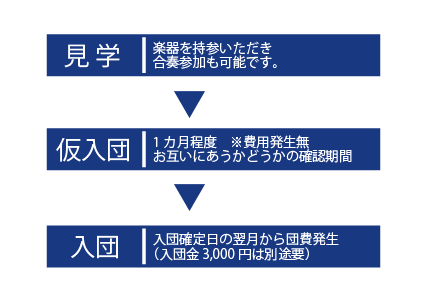 見学後、入団をご希望の方には1か月間の仮入団期間を設けています。この期間中は 団費などの費用は一切かかりません。(入団翌月から団費が発生します。)
